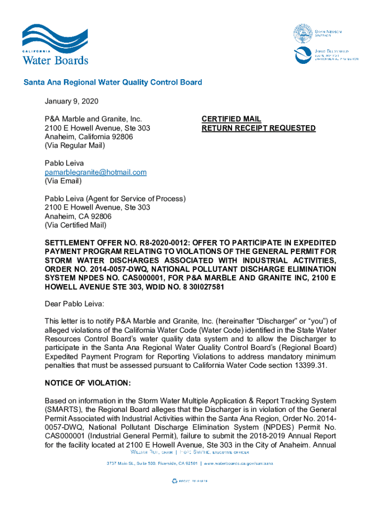 January 9, 2020 P&A Marble and Granite, Inc. 2100 E Howell Avenue, Ste 303 Anaheim, California 92806 (Via Regular Mail)CERTIFIED MAIL RETURN RECEIPT REQUESTED Pablo Lava pamarblegranite hotmail.com