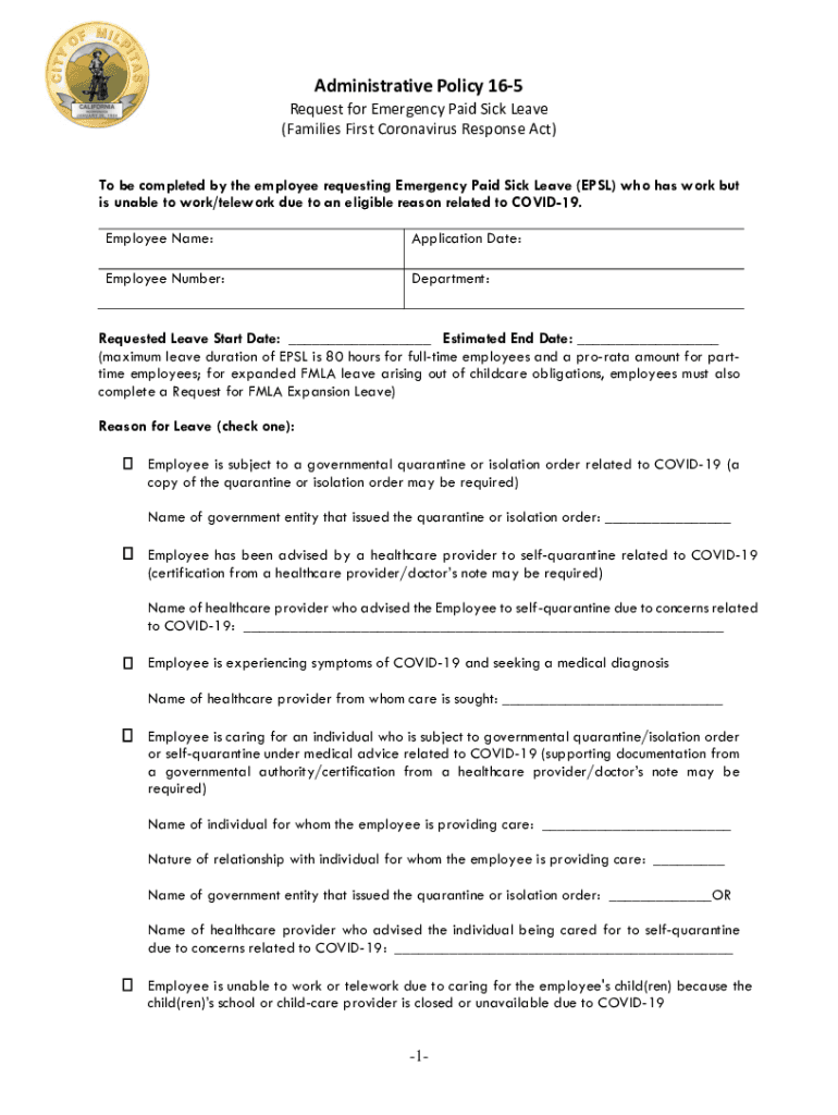 Get the free Emergency Paid Sick Leave Act and ... - City of Milpitas