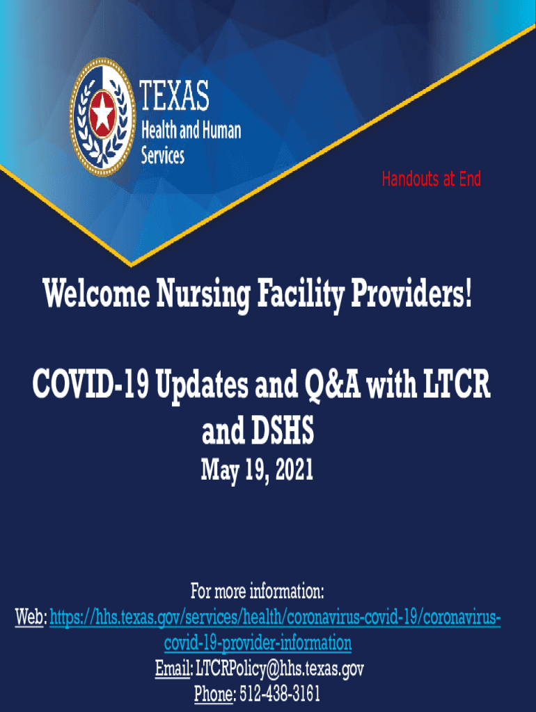 Handouts at Unwelcome Nursing Facility Providers! COVID-19 Updates and Q&A with LCR and DSS May 19, 2021For more information: Web: https://hhs.texas.gov/services/health/coronaviruscovid19/coronaviruscovid19providerinformation