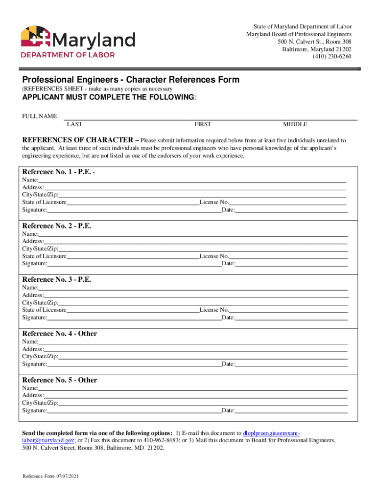 State of Maryland Department of Labor Maryland Board of Professional Engineers 500 N. Calvert St., Room 308 Baltimore, Maryland 21202 (410) 2306260Professional Engineers Character References Form