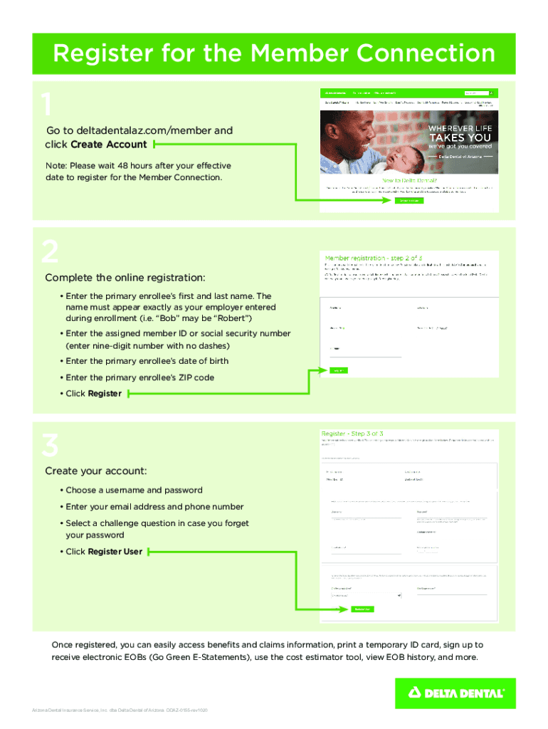 Register for the Member Connection1Go to deltadentalaz.com/member and click Create Account Note: Please wait 48 hours after your effective date to register for the Member Connection.2Complete the