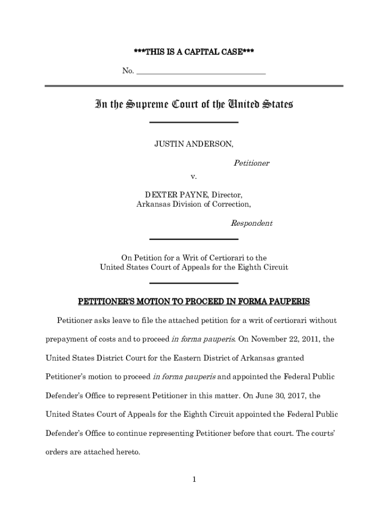 ***THIS IS A CAPITAL CASE*** No. In the Supreme Court of the United StatesJUSTIN ANDERSON, Petitioner v. DEXTER PAYNE, Director, Arkansas Division of Correction, Respondents Petition for a Writ of