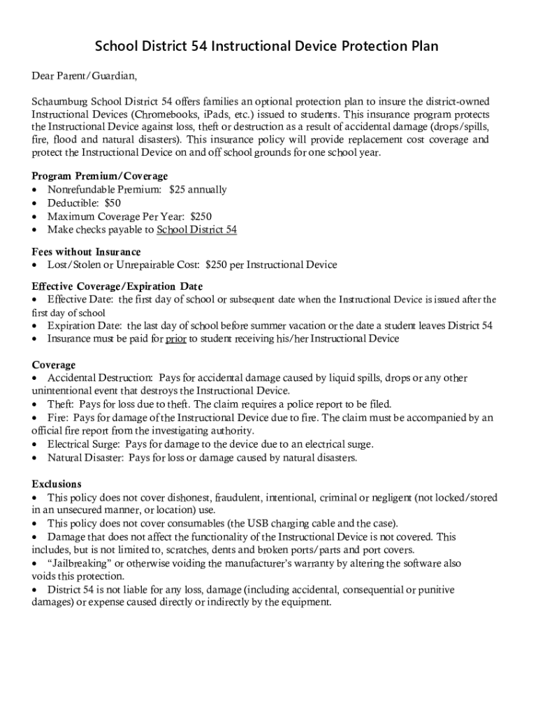 School District 54 Instructional Device Protection Plan Dear Parent/Guardian, Schaumburg School District 54 offers families an optional protection plan to insure the district owned Instructional Devices