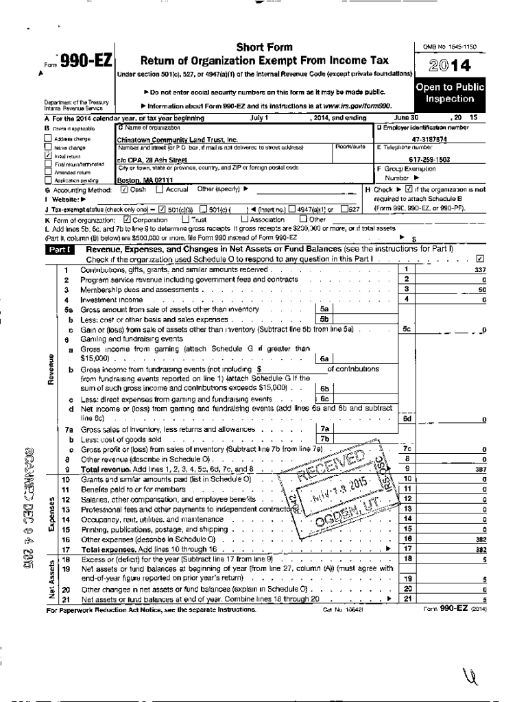 Form 990EZShort Form Return of Organization Exempt From Income Tax OMB No 1545115020014Under section 501(c), 527, or 4947(a)(1) of the Internal Revenue Code (except private foundations) Do not enter