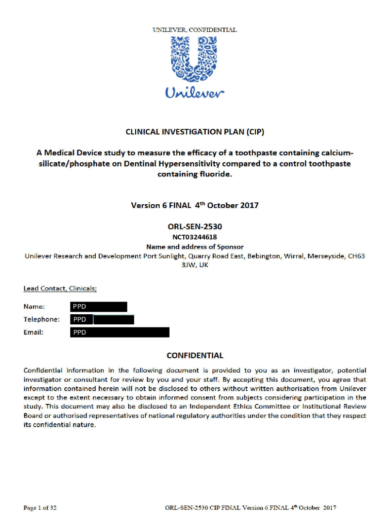 NCT03244618PPD PPD UNILEVER, CONFIDENTIALApproval of the Amended CPI have thoroughly read and reviewed the study protocol. This study will be conducted in compliance with the protocol, the Declaration
