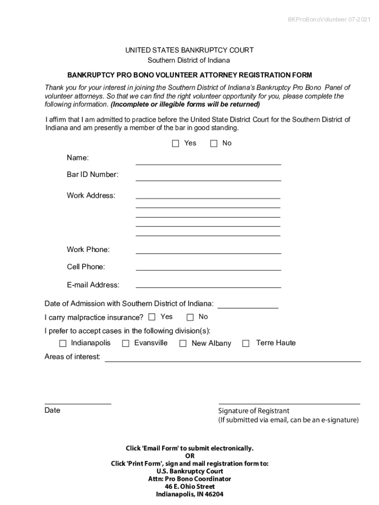 BKProBonoVolunteer 072021UNITED STATES BANKRUPTCY COURT Southern District of Indiana BANKRUPTCY PRO BONO VOLUNTEER ATTORNEY REGISTRATION FORM Thank you for your interest in joining the Southern District