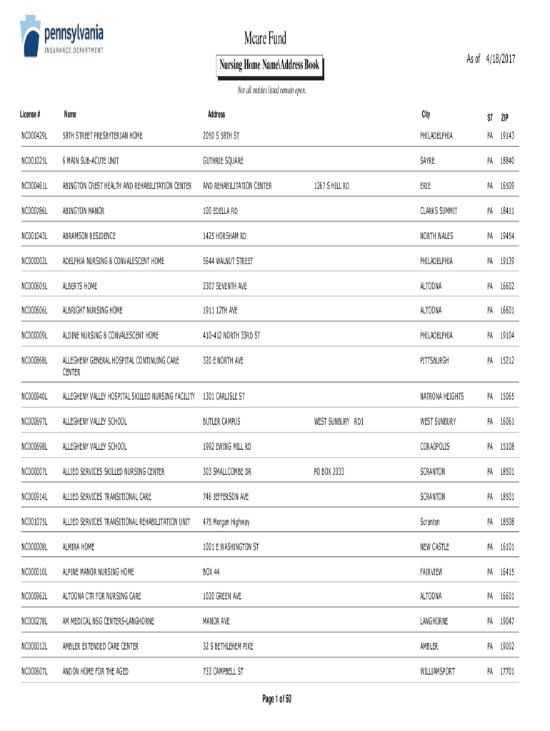 Care Fund As nursing Home Headdress Book4/18/2017Not all entities listed remain open. License #NameAddressCitySTZIPNC000429L58TH STREET PRESBYTERIAN HOME2050 S 58TH STPHILADELPHIAPA19143NC001025L6