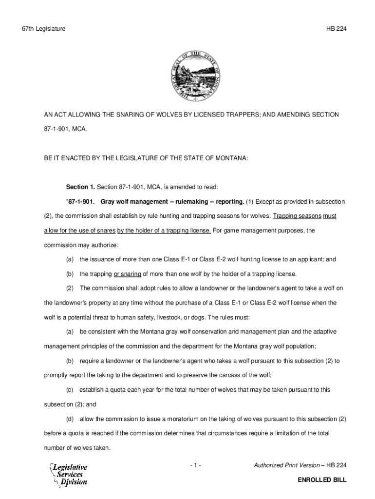 Get the free 67th Legislature HB 224 AN ACT ALLOWING THE SNARING OF WOLVES ... - leg mt