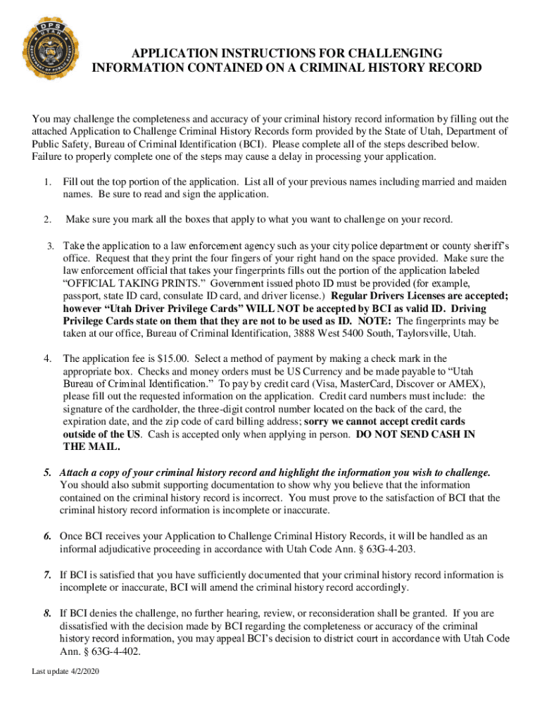APPLICATION INSTRUCTIONS FOR CHALLENGING INFORMATION CONTAINED ON A CRIMINAL HISTORY Record may challenge the completeness and accuracy of your criminal history record information by filling out the