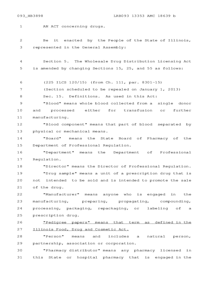093 HB3898LRB093 13353 AMC 18639 b1AN ACT concerning drugs.2Be3enactedbythe People of the State of Illinois, represented in the General Assembly:4 5itSection 5. The Wholesale Drug Distribution Licensing