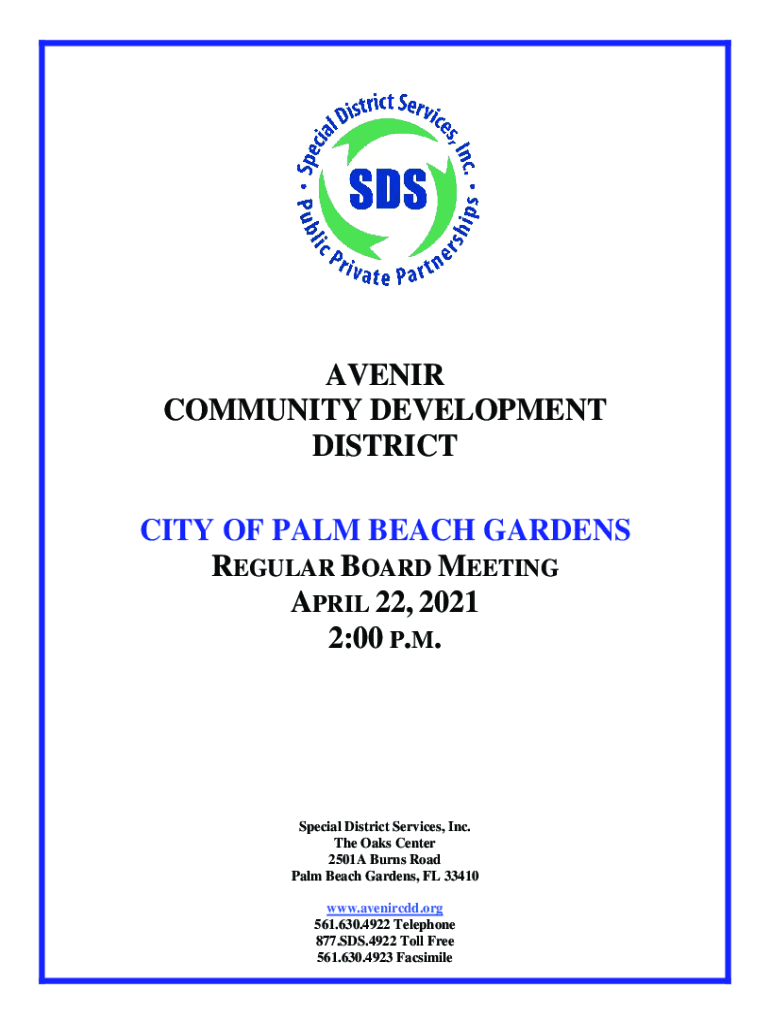 AVE NIR COMMUNITY DEVELOPMENT DISTRICT CITY OF PALM BEACH GARDENS REGULAR BOARD MEETING APRIL 22, 2021 2:00 P.M. Special District Services, Inc. The Oaks Center 2501A Burns Road Palm Beach Gardens,