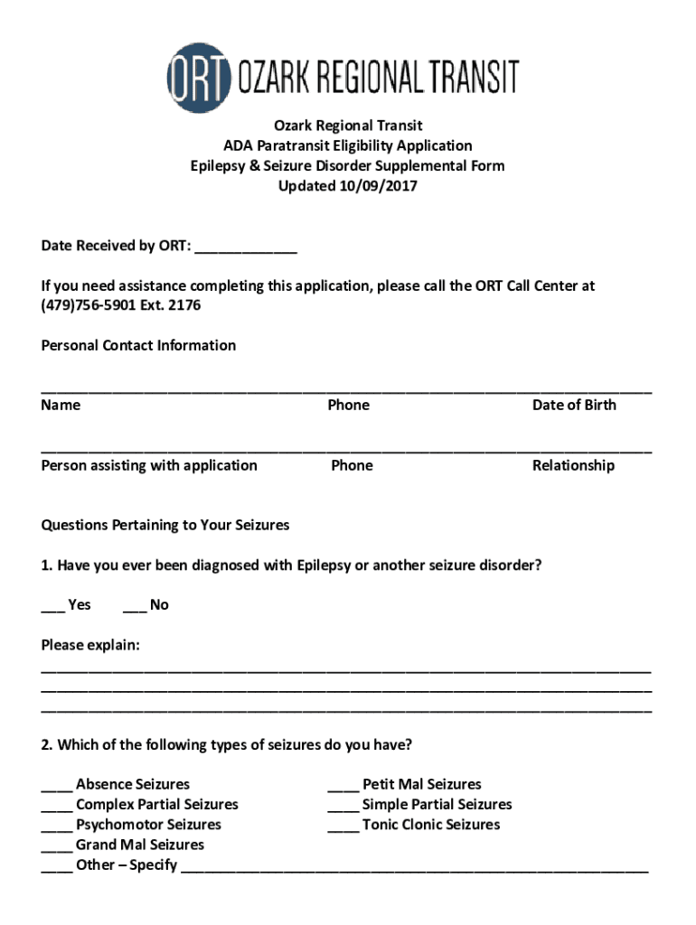 Ozark Regional Transit ADA Para transit Eligibility Application Epilepsy & Seizure Disorder Supplemental Form Updated 10/09/2017Date Received by ORT: If you need assistance completing this application,