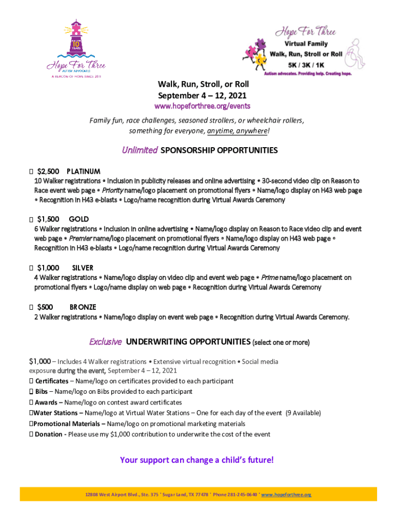 Walk, Run, Stroll, or Roll September 4 12, 2021 www.hopeforthree.org/events Family fun, race challenges, seasoned strollers, or wheelchair rollers, something for everyone, anytime, anywhere! Unlimited