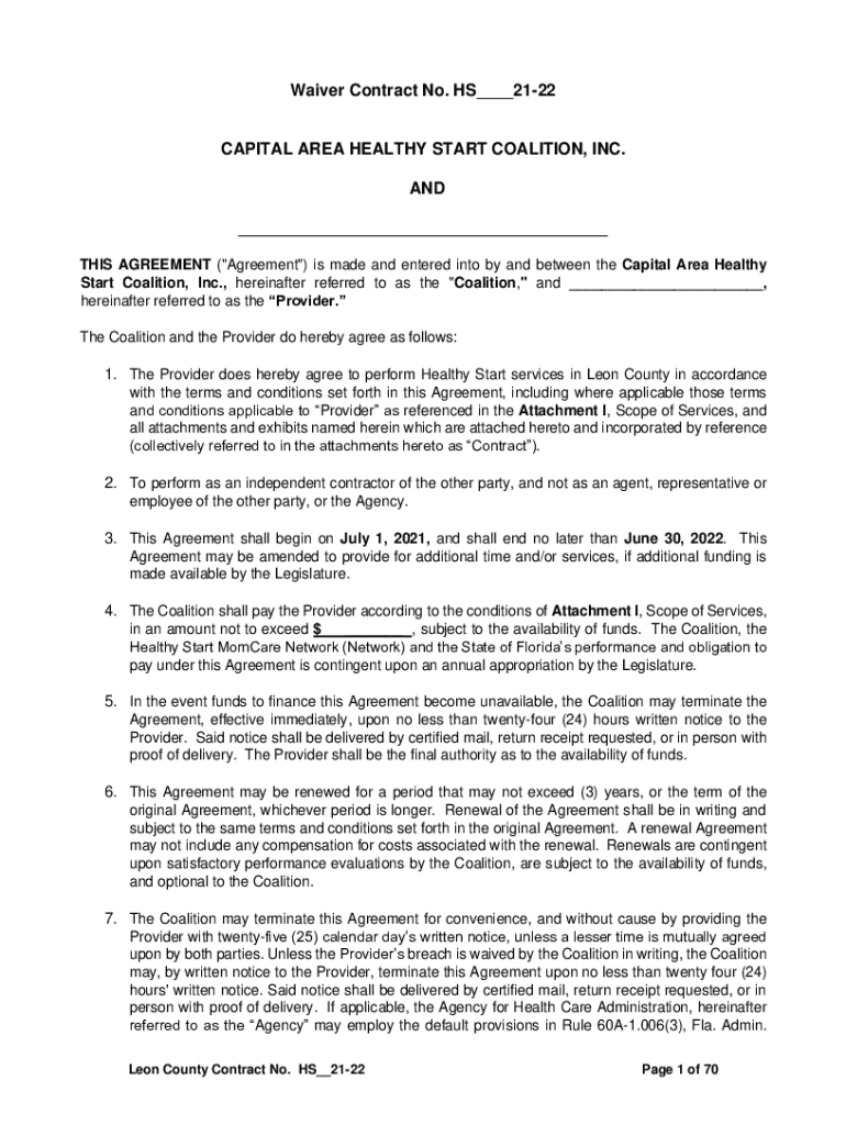 Waiver Contract No. HS 2122CAPITAL AREA HEALTHY START COALITION, INC. AND THIS AGREEMENT (“Agreement “) is made and entered into by and between the Capital Area Healthy Start Coalition, Inc.,