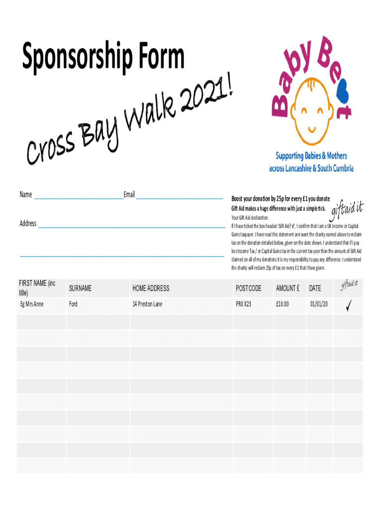 Sponsorship Form ! 1 2 0 2 k l a W y a B s s o r C Name Email Boost your donation by 25p for every 1 you donate Gift Aid makes a huge difference with just a simple tick. Address: FIRST NAME (inc title)