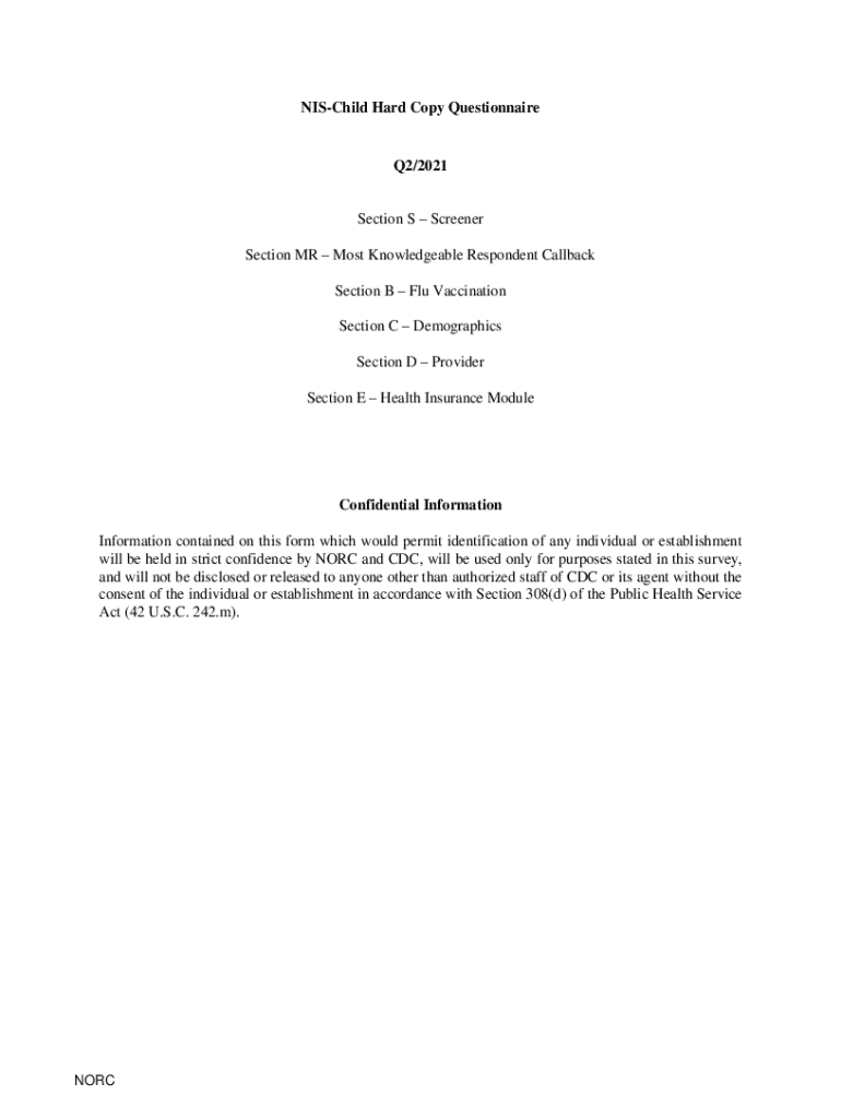 Child Hard Copy QuestionnaireQ2/2021Section S Screener Section MR Most Knowledgeable Respondent Callback Section B Flu Vaccination Section C Demographics Section D Provider Section E Health Insurance