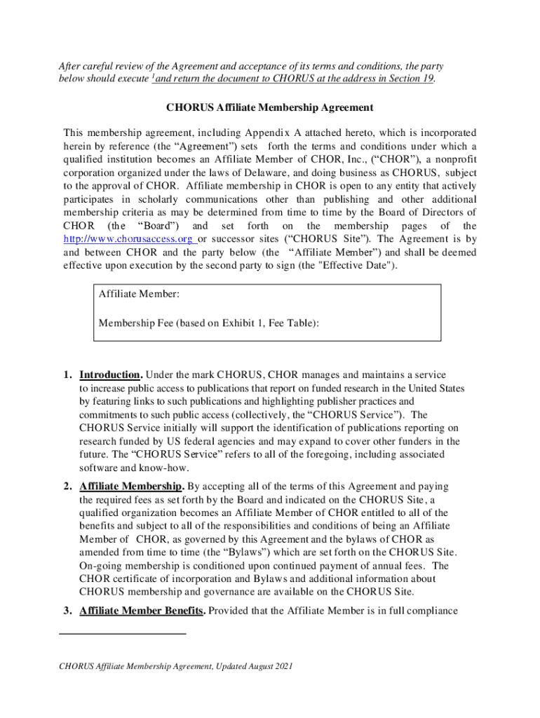 After careful review of the Agreement and acceptance of its terms and conditions, the party below should execute 1and return the document to CHORUS at the address in Section 19. CHORUS Affiliate Membership