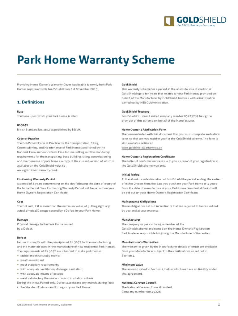 Park Home Warranty Scheme Providing homeowners Warranty Cover Applicable to newly built ParkGoldShieldHomes registered with Goldfield From 1st November 2015This warranty scheme for a period at the