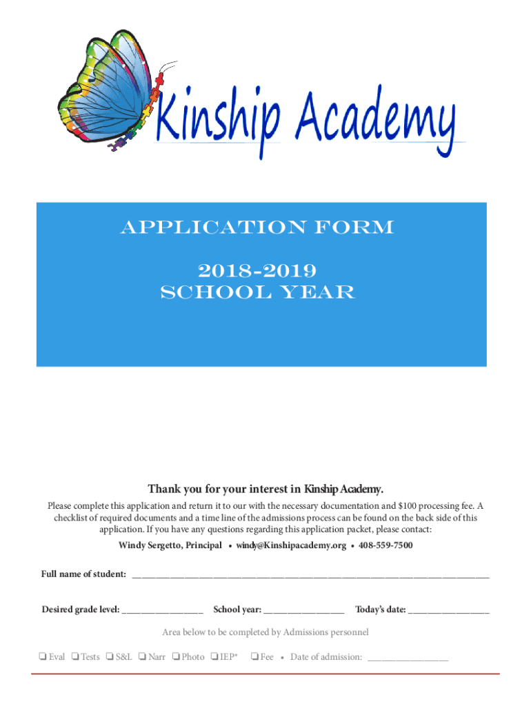 Application form 20182019 School Earthen you for your interest in Kinship Academy. Please complete this application and return it to our with the necessary documentation and $100 processing fee. A