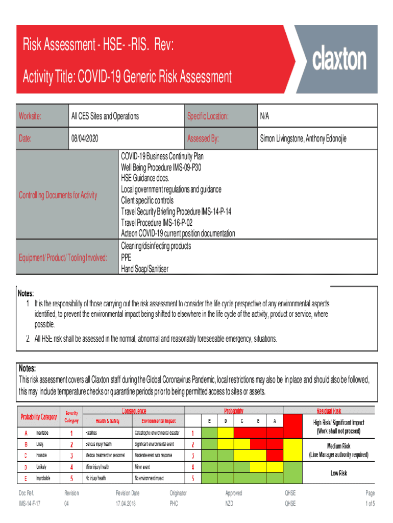 Risk Assessment HSE RIS. Rev: Activity Title: COVID-19 Generic Risk Assessment Worksite:All CES Sites and OperationsSpecific Location:N/Date:08/04/2020Assessed By:Simon Livingstone, Anthony EdonojieControlling