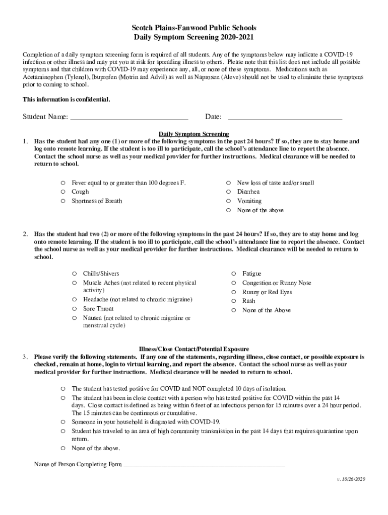 Scotch PlainsFanwood Public Schools Daily Symptom Screening 20202021 Completion of a daily symptom screening form is required of all students. Any of the symptoms below may indicate a COVID-19 infection