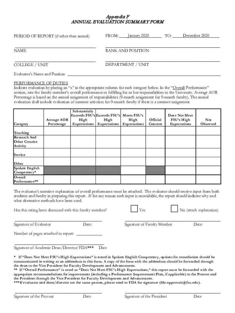 Appendix F ANNUAL EVALUATION SUMMARY FORM PERIOD OF REPORT (if other than annual)December 2020 January 2020 FROM: TO: NAME RANK AND POSITION COLLEGE / UNIT DEPARTMENT / UNITEvaluators Name and Position