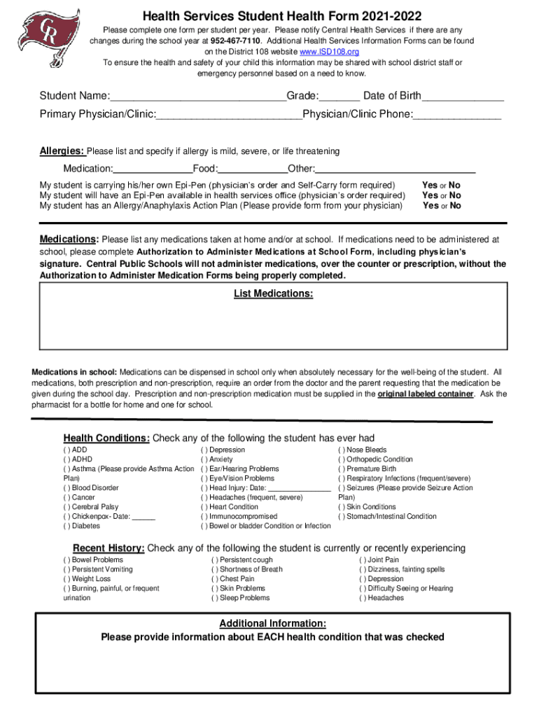 Health Services Student Health Form 20212022 Please complete one form per student per year. Please notify Central Health Services if there are any changes during the school year at 9524677110. Additional