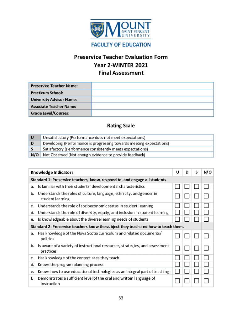 Preservice Teacher Evaluation Form Year 2WINTER 2021 Final Assessment Preservice Teacher Name: Practicum School: University Advisor Name: Associate Teacher Name: Grade Level/Courses:Rating Scale U