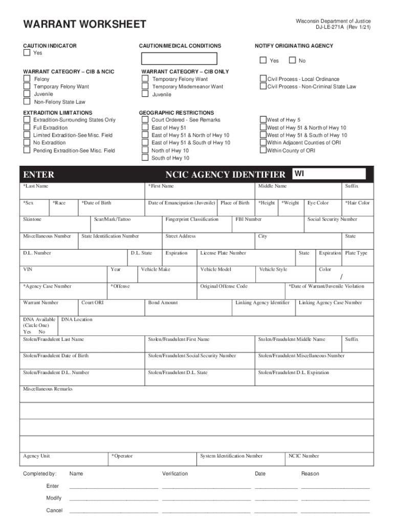 Wisconsin Department of Justice DJLE271A (Rev 1/21)WARRANT WORKSHEET CAUTION INDICATOR Resolution/MEDICAL CONDITIONSNOTIFY ORIGINATING AGENCY Restaurant CATEGORY CIA & CIC Felony Temporary Felony