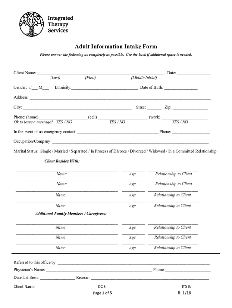 Adult Information Intake Form Please answer the following as completely as possible. Use the back if additional space is needed. Client Name: Date: (Last) (First) (Middle Initial) Gender: F M Ethnicity: