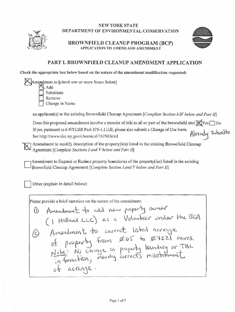NEW YORK STATE DEPARTMENT OF ENVIRONMENTAL CONSERVATIONBROWNFIELD CLEANUP PROGRAM (BCP) APPLICATION TO AMEND AND AMENDMENTPART I. BROWNFIELD CLEANUP AMENDMENT APPLICATION Check the appropriate box