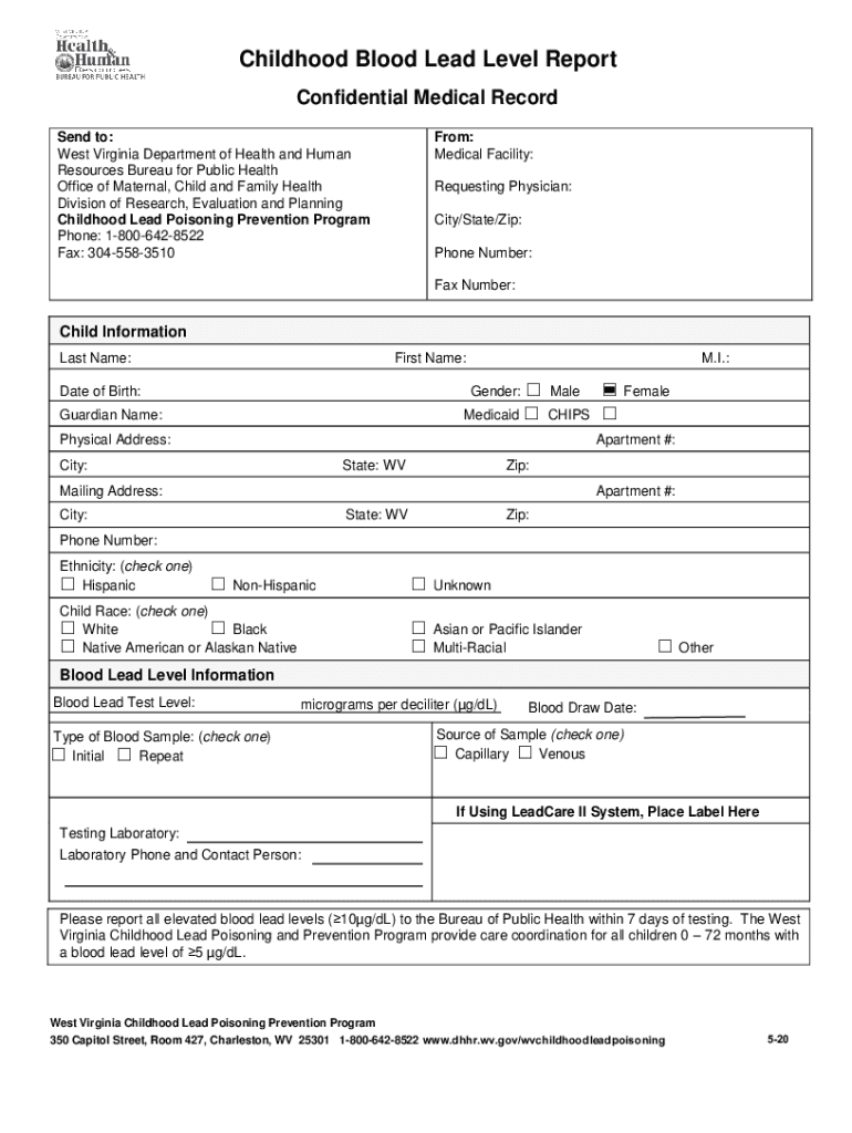 Childhood Blood Lead Level Report Confidential Medical Record Form Send to: West Virginia Department of Health and Human Resources Bureau for Public Health Office of Maternal, Child and Family Health