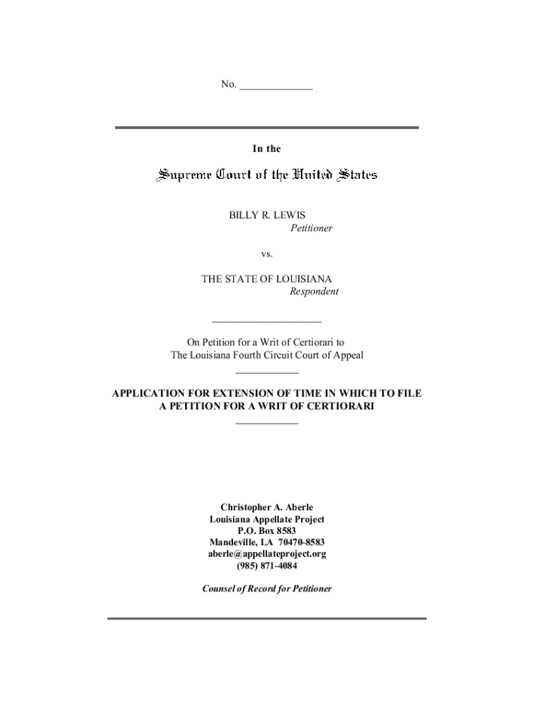 No. In Billy R. LEWIS Petitioner vs. THE STATE OF LOUISIANA Respondent On Petition for a Writ of Certiorari to The Louisiana Fourth Circuit Court of Appeal APPLICATION FOR EXTENSION OF TIME IN WHICH