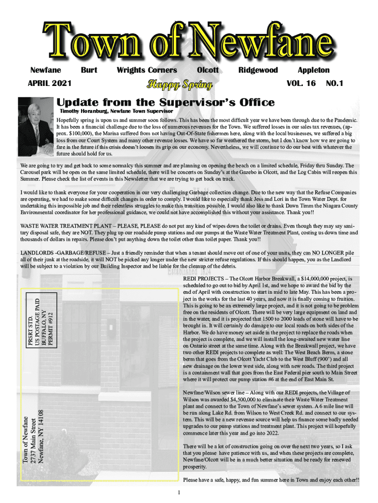 Town of NewfaneNewfaneAPRIL 2021BurtWrights CornersOlcottRidgewoodHappy SpringAppletonVOL. 16NO.1Update from the Supervisors Office Timothy Hamburg, Newman Town SupervisorHopefully spring is upon