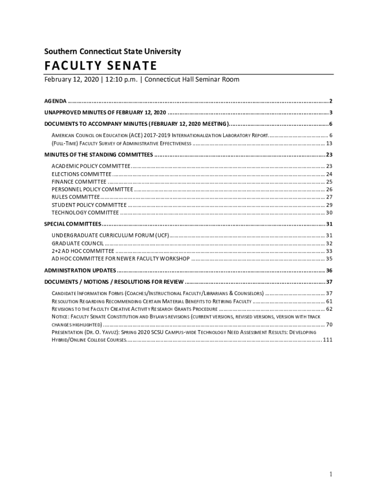Southern Connecticut State UniversityFACULTY SENATE February 12, 2020 12:10 p.m. Connecticut Hall Seminar Room AGENDA ..........................................................................................................................................................
