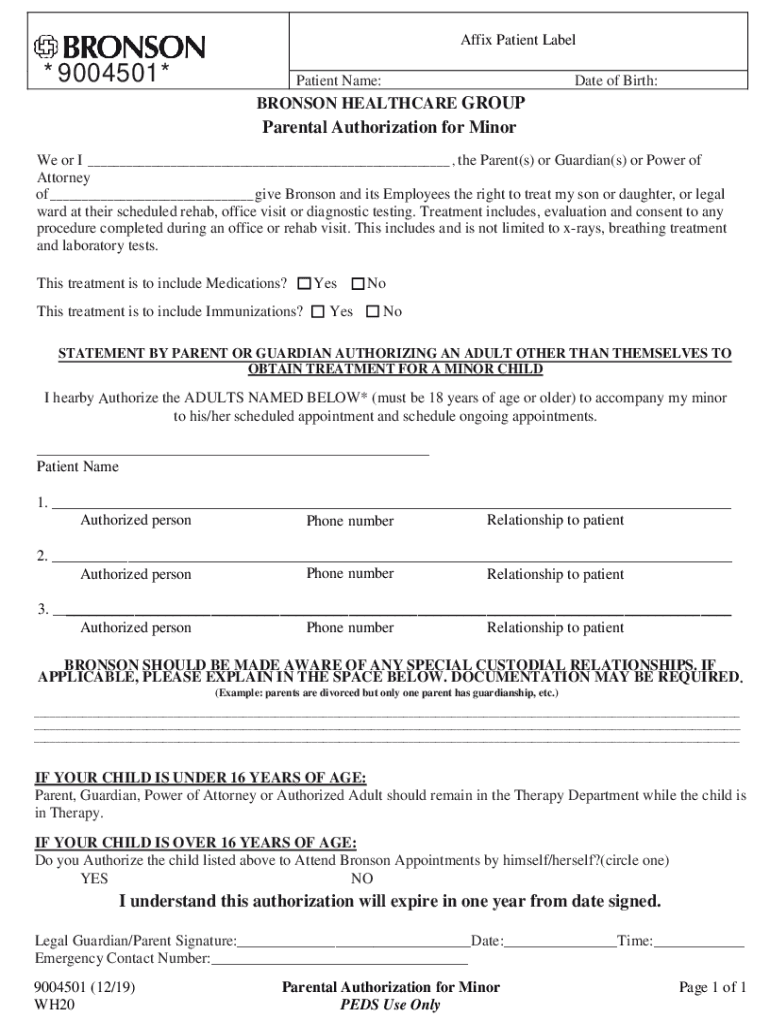 Affix Patient Label×9004501×Patient Name:Date of Birth:BRONSON HEALTHCARE GROUPParental Authorization for Minor We or I, the Parent(s) or Guardian(s) or Power of Attorney of give Bronson and its