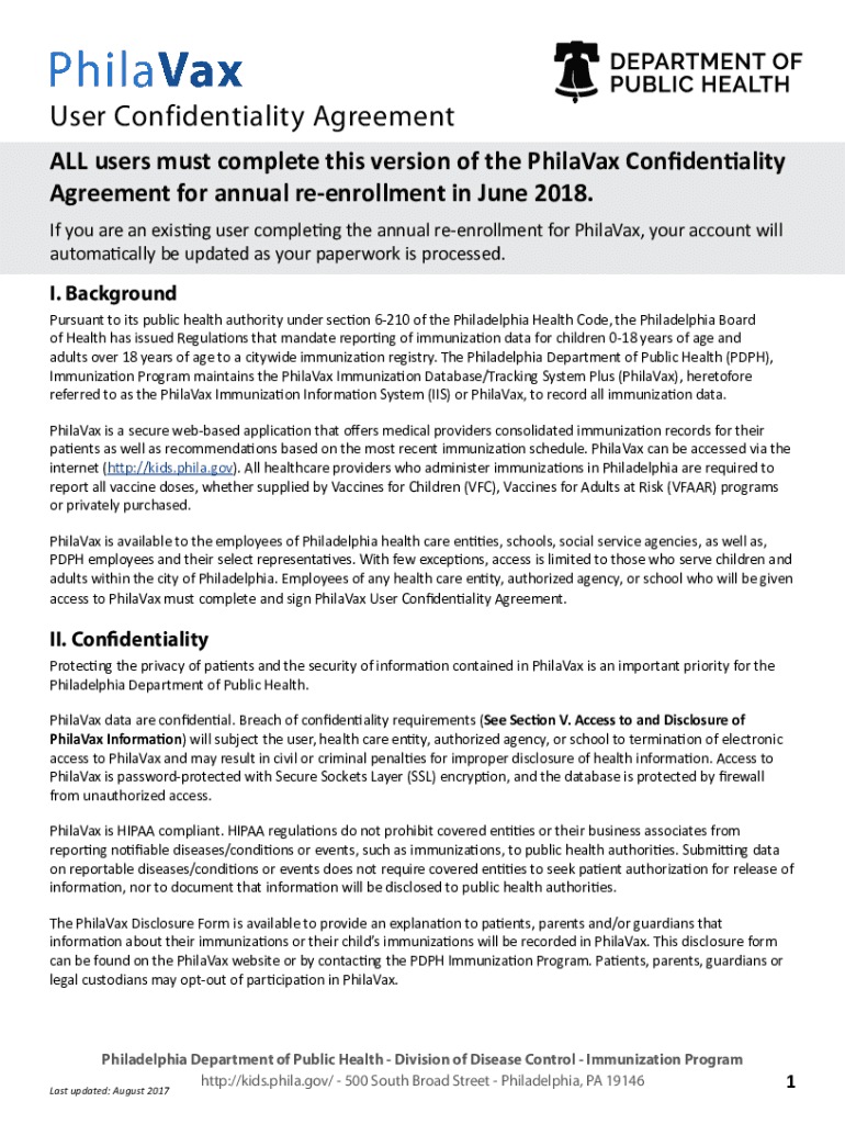 Get the free Philavax User Confidentiality Agreement - Philadelphia