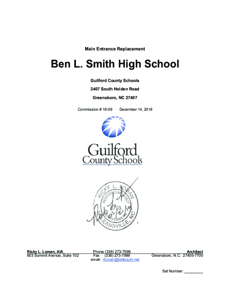 Main Entrance Replacement Ben L. Smith High School Guilford County Schools 2407 South Holden Road Greensboro, NC 27407 Commission # 1809Ricky L. Woman, AIR 603 Summit Avenue, Suite 102December 14,