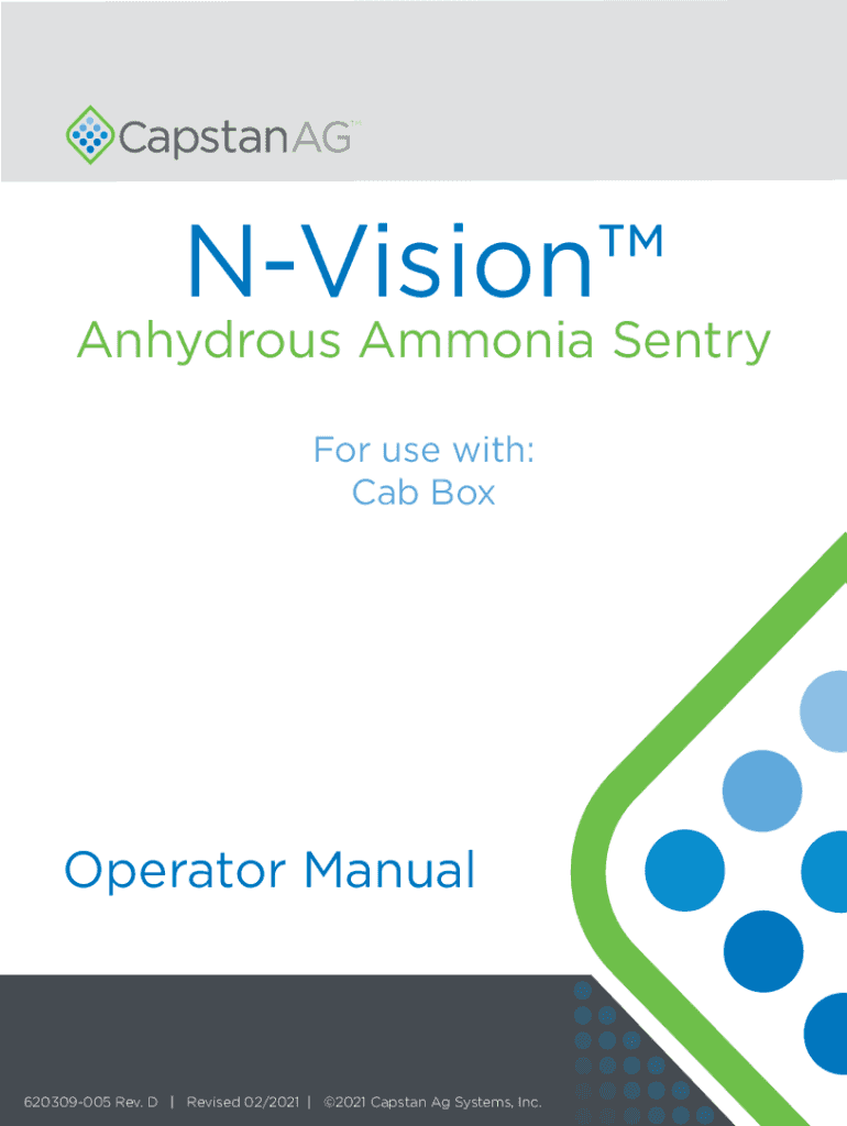 TMNVisionAnhydrous Ammonia Sentry For use with: Cab Cooperator Manual620309005 Rev. D Revised 02/2021 2021 Capstan Ag Systems, Inc.TMT thank you for your business! At Capstan AG, our goal is to redefine