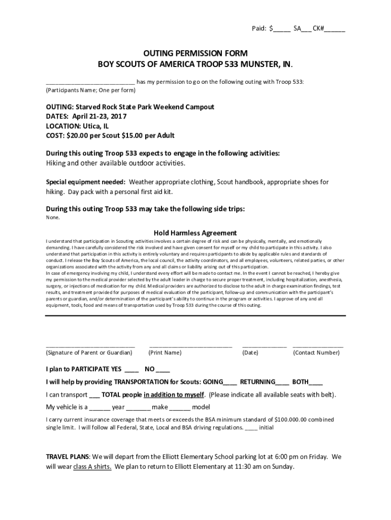 Paid:$ SA CK# OUTINGPERMISSIONFORM BOYSCOUTSOFAMERICATROOP533MUNSTER,IN. HasmypermissiontogoonthefollowingoutingwithTroop533: (ParticipantsName;One perform) OUTING:StarvedRockStateParkWeekendCampout
