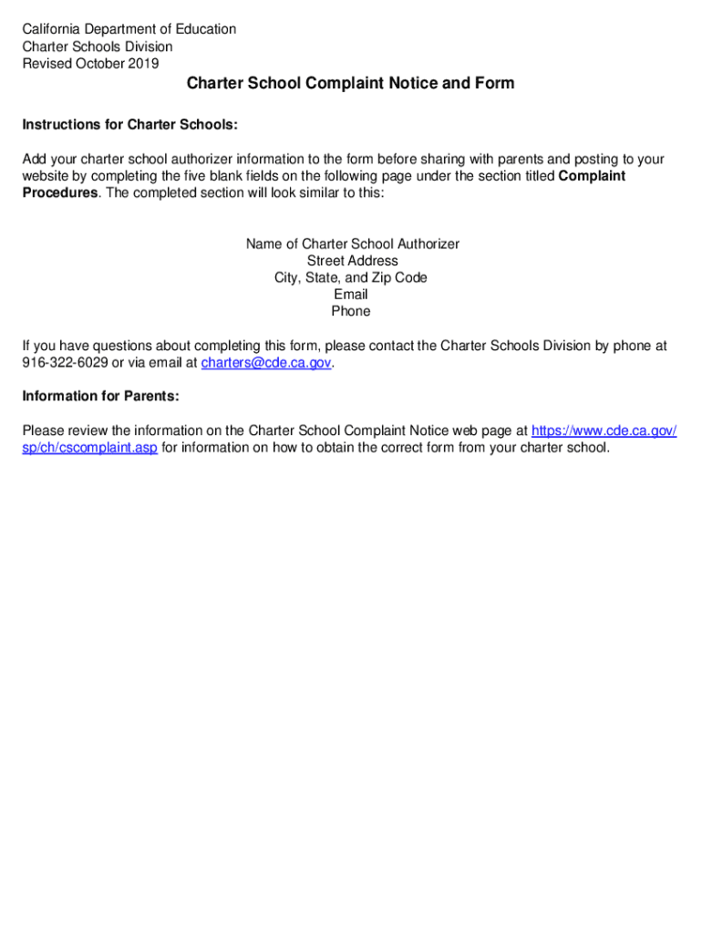 California Department of Education Charter Schools Division Revised October 2019Charter School Complaint Notice and Form Instructions for Charter Schools: Add your charter school authorizer information
