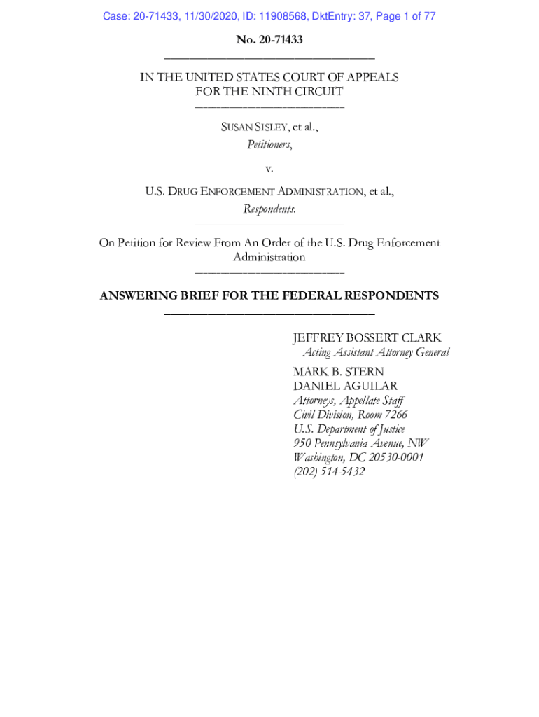 Case: 2071433, 11/30/2020, ID: 11908568, Entry: 37, Page 1 of 77No. 2071433 IN THE UNITED STATES COURT OF APPEALS FOR THE NINTH CIRCUIT SUSAN SISTER, et al., Petitioners, v. U.S. DRUG ENFORCEMENT