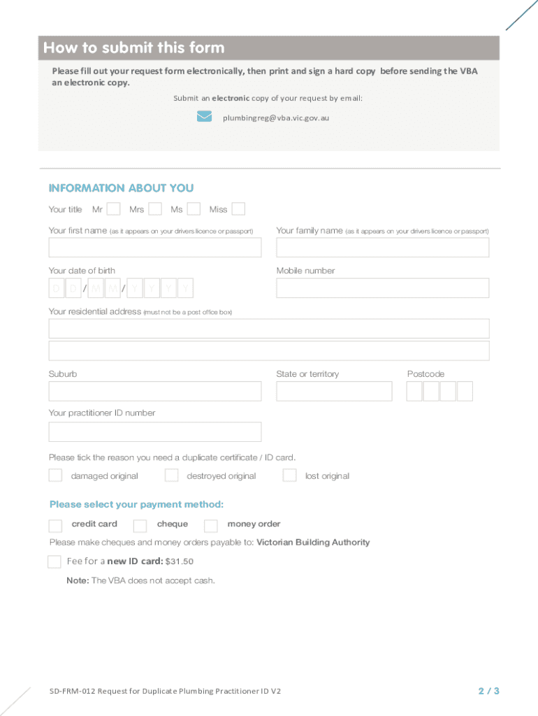 REQUEST FOR A DUPLICATE ID CARD (PLUMBING)REQUEST FOR DUPLICATE ID ADHERES WHAT YOU NEED TO DO PLEASE COMPLETE AND SUBMIT THIS FORM IF YOU REQUIRE A DUPLICATE ID CARD. The VBA can issue a replacement