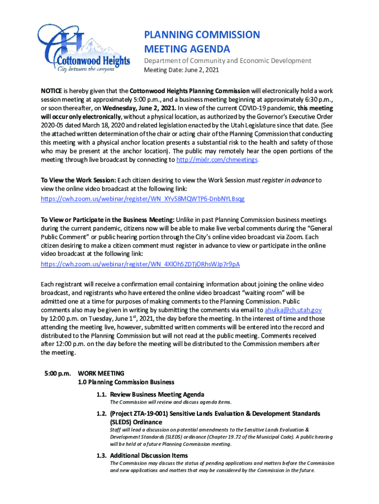 PLANNING COMMISSION MEETING AGENDADepartment of Community and Economic Development Meeting Date: June 2, 2021NOTICE is hereby given that the Cottonwood Heights Planning Commission will electronically