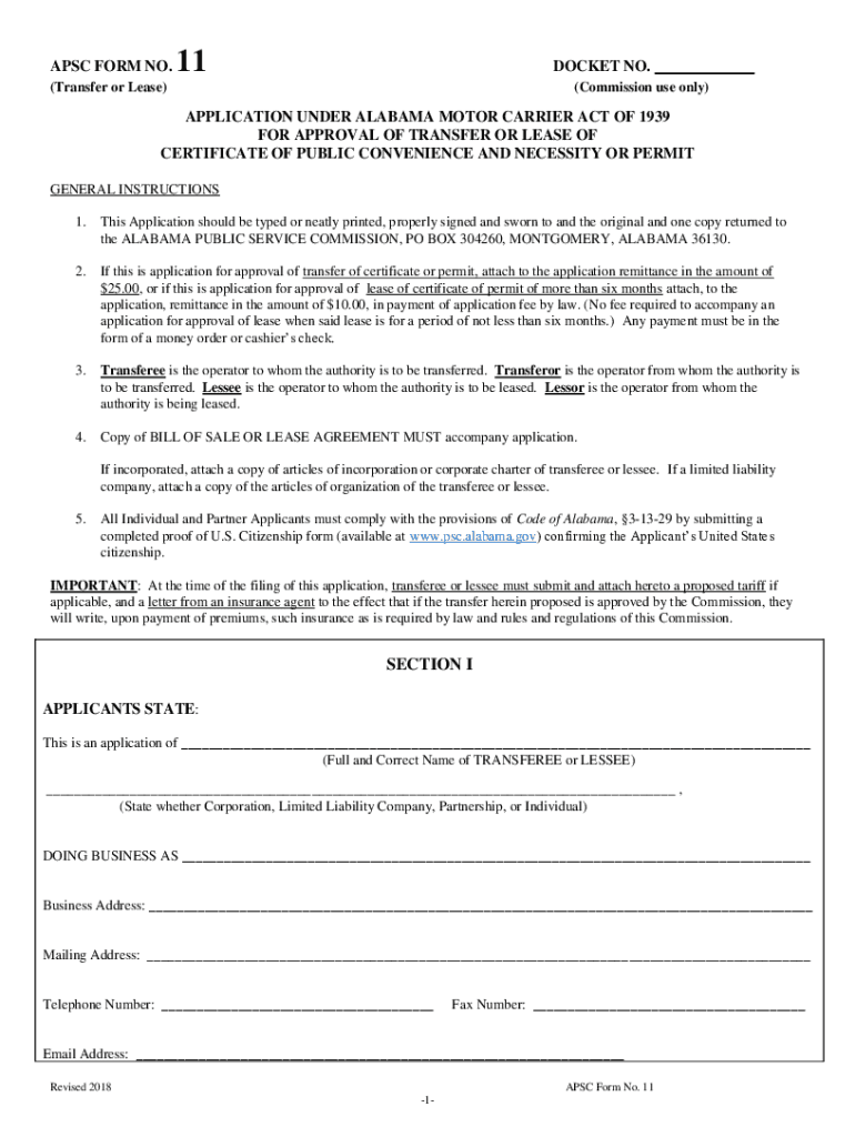 APC Forms NO.11DOCKET NO.(Transfer or Lease)(Commission use only)APPLICATION UNDER ALABAMA MOTOR CARRIER ACT OF 1939 FOR APPROVAL OF TRANSFER OR LEASE OF CERTIFICATE OF PUBLIC CONVENIENCE AND NECESSITY