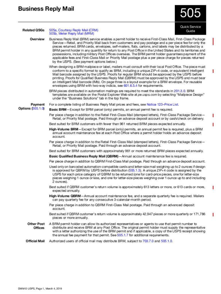 Get the free Business Reply Mail 505 - USPS505 Quick Service GuidePostal Explorer6 Business Reply...