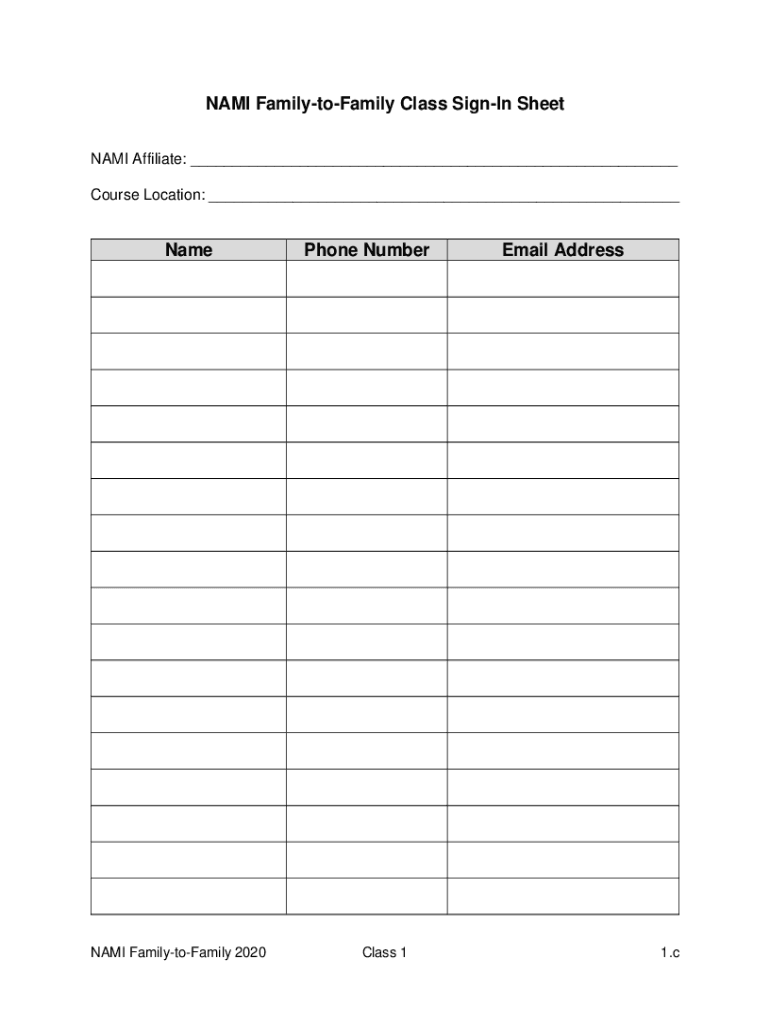 Obtain the sign-in sheet provided by the NAMI Family-to-Family class organizer.