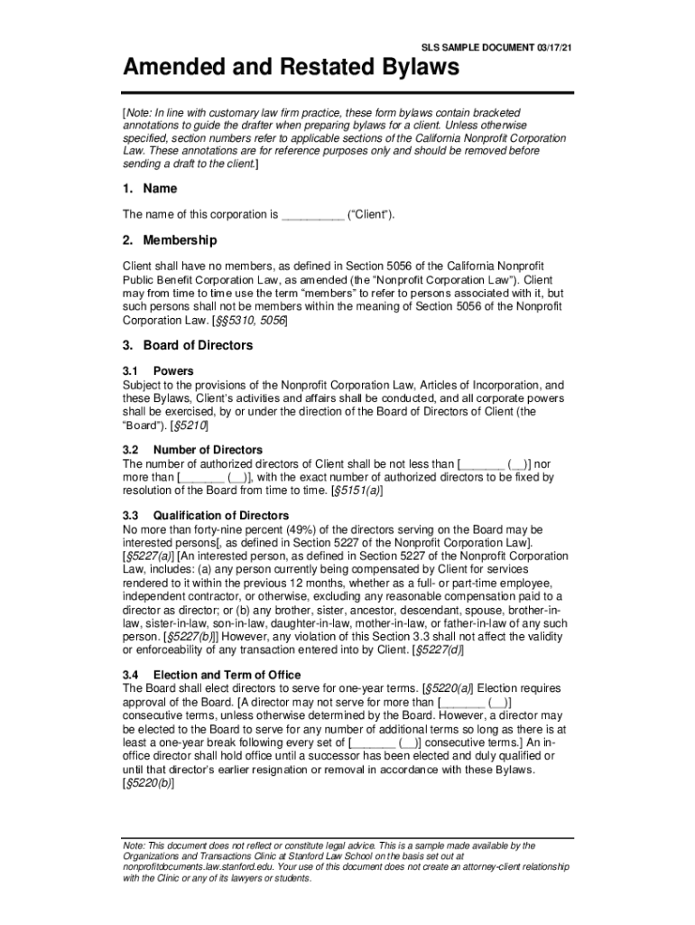 SLS SAMPLE DOCUMENT 03/17/21Amended and Restated Bylaws Note: In line with customary law firm practice, these form bylaws contain bracketed annotations to guide the drafter when preparing bylaws for