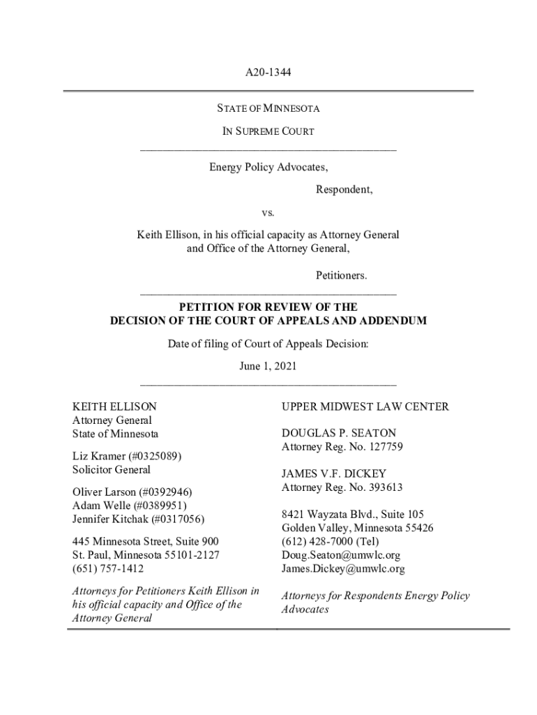 A201344 STATE OF MINNESOTA IN SUPREME COURT Energy Policy Advocates, Respondent, vs. Keith Ellison, in his official capacity as Attorney General and Office of the Attorney General, Petitioners. PETITION