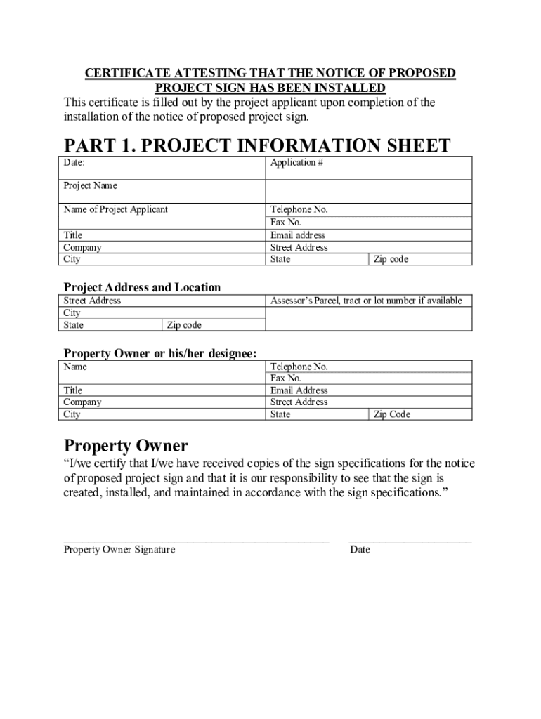 CERTIFICATE ATTESTING THAT THE NOTICE OF PROPOSED PROJECT SIGN HAS BEEN INSTALLED This certificate is filled out by the project applicant upon completion of the installation of the notice of proposed